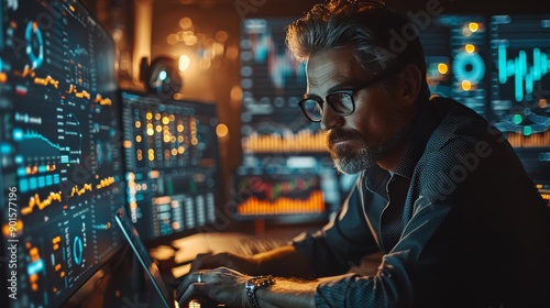 technology, night time, analysis, screen, statistic, trend, professional, concentration, research, communication, monitoring, software, system, productivity, multitask, intelligence, forecasting, innovation, generative, ai