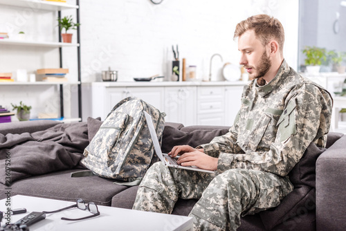 Focused army soldier using laptop on couch at home