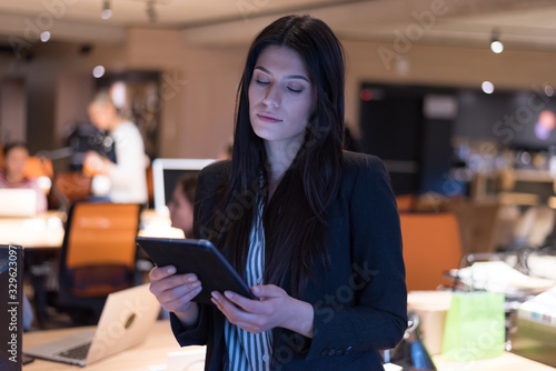 Focused beautiful young businesswoman using a digital tablet while has a live meeting via social network together with her colleagues.