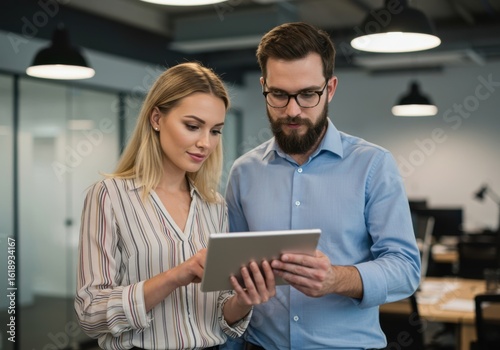 Focused business professionals collaborating on a digital tablet in a modern office environment