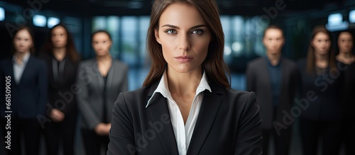 Focused female executive leading a team making eye contact with the camera