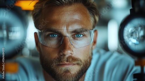 Focused german engineer analyzes car parts and machinery in the automotive industry