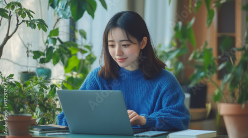 japanese, woman, laptop, smiling, typing, work, office, focused, productivity, technology, desk, notebook, smartphone, plant, greenery, comfortable, fresh, atmosphere, workspace, home office, modern, business, professional, casual attire, digital, lifestyle, bright, clean, organised, minimalist, creativity, happy, positive, relaxed, concentrated, natural, interior, environment, cosy, elegant, home, ambient, tranquil, light, daylight, indoor