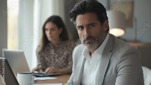 focused, man, dark, hair, office, workspace, woman, laptop, modern, collaboration, concentration, productivity, professional, technology, communication, teamwork, serious, business, attire, light, soft, sharpened, interior, design, casual attire, meeting, digital, device, work, environment, attention, professionalism, multitask, creativity, calm, atmosphere, determination, expression, analysis, adult, lifestyle, decor, dynamic, efficient