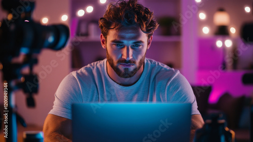man, laptop, working, cosy, illuminated, creative, modern, technology, home, sharpened, room, light, casual attire, young, male, indoor, computer, photo, lifestyle, concentration, digital, evening, workspace, stylish, wear, soft, ambience, artistic, bright, screen, equipment, portrait, serious, relaxed, contemporary, design, personal, hobby, cyberspace, communication, social, media, content, video, streaming, setup, environment, inspiration, youth