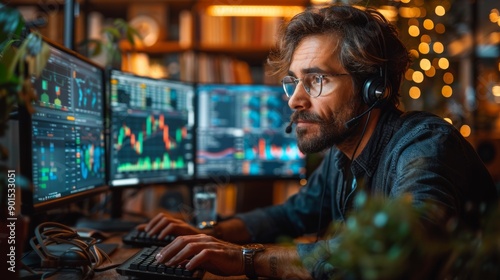 trader, analysis, home office, evening, computer, chart, datum, concentration, headset, plant, cosy, investment, stock, trading, technology, workspace, professional, finance, economy, digital, multitask, strategic, software, forex, performance, graph, statistic, pattern, interface, screen, signal, research, product, optical, bustling, productivity, commitment, generative, ai