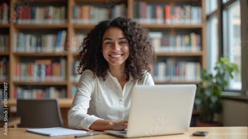 student, woman, library, laptop, studying, research, smiling, curly hair, book, bookshelf, learning, education, missy, sharpened, confidence, happy, cheerful, productive, peace, calm, cognition, workspace, university, college, reading, modern, technology, digital, desk, cosy, bright, joyful, academic, professional, school, smart, scholar