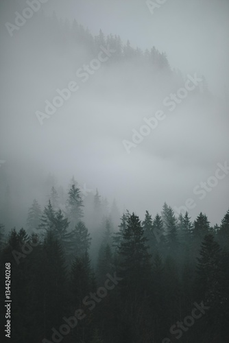 fog, forest, pine, tree, mystical, gloomy, moody, twilight, rain, rainy, nature, mountain