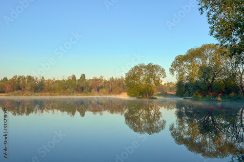 foggy river with the trees are reflected in water