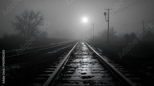 Fog-shrouded railroad tracks stretch into the distance.