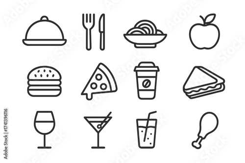 food, icon, set, drink, vector, line, symbol, eatery, menu, illustration, signs, collection, outline, design, web, graphic, isolated, white, black, meal, dinner, lunch, fast food, cafes, burger, pizza, hot drink, sandwich, pasta, cocktail, wine, apple, chicken, juice, bar, cooking, eat, dish, simple, kitchen, cutlery, modern, pictogram, delivery, take-away, serving
