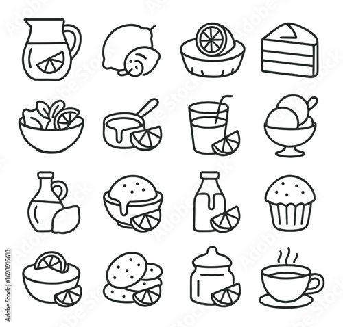 food, drink, linear, icon, set, lemonade, citrous, pie, cake, salad, sauce, juice, ice, cream, muffin, ice cream, beverage, sweet, dessert, refreshment, snack, bakery, pastry, meal, dining, kitchen, culinary, tasty, delicious, epicure, cookery, treat, serving, garnishing, savoury, delight, nourishment, brunch, breakfast, lunch, dinner, refresh, nourish, chef, cook, homemade, fresh