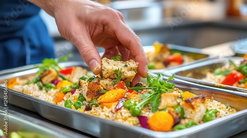 Food and Drink, Plant-Based Cuisine Hand garnishing colorful dish with fresh ingredients in a kitchen.
