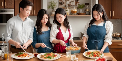 Food and people concept. Couple making homemade healthy food for dinner at home kitchen. Fresh ingredients. Tomato, garlic, pepper, parmesan cheese and many other meals on wooden table. Generative AI