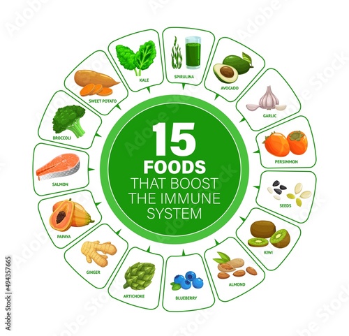 food, booster, immune, system, health, vector, infographic, chart, graph, healthy, diet, nourishment, infographic, wheel, diagram, fruit, vegetable, fish, nut, berry, greener, avocado, garlic, ginger, broccoli, vitamin, organic, meal, info, graphic, cartoon, illustration, papaya, salmon, potato, almond, seed, datum, statistic, be of use, group, green, vegetarian, persimmon, kiwi, artichoke, blueberry, kale