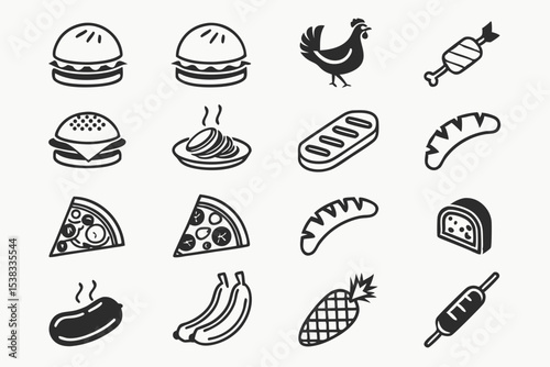 food, icon, vector, set, bread, vignetting, illustration, cake, drawing, vintage, bakery, pattern, doodle, symbol, pizza, seamless, meal, meat, design, fish, cartoon, collection, hamburger, breakfast, eat