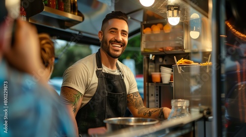 Food truck. A smiling man of Turkish appearance in an apron looks at the camera while standing near the counter