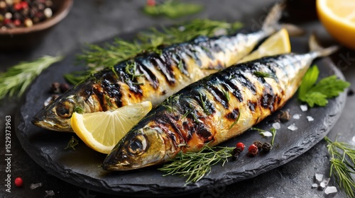 Foods reduce stroke risk. Grilled fish with lemon served on a slate plate, garnished with herbs and spices.