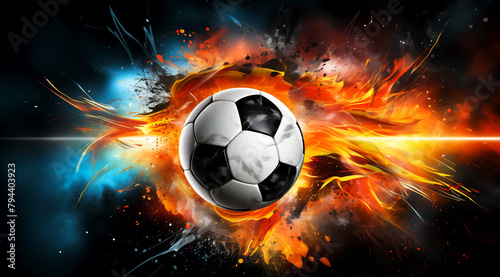 championship, football, soccer, ball, game, fire, ice, energy, explosion, dynamic, sport, passion, intensity, contrast, warm tones, motion, action, flames, frost, power, speed, burst, clash, competition, digital artwork, illustration, impact, excitement, athletic, abstract background, movement, swirl, spark, collision