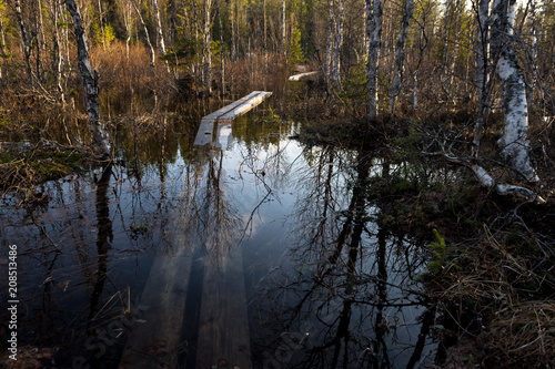 water, footbridge, path, road, flooding, obstacle, landscape, forest, river, tree, duck pond, blue, spring, grass, calm, green, winter, season, cloud, fall, morning, wood