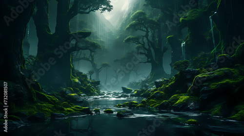 forest, tree, oasis, mist, jungle, plant, vegetation, natural, watercolor, fir, ink, autumn, spring, equinox, mountain, moss, green, luxurious, enchanted forest, dense, fog, sunset, sunrise, landscape, illustration, background, wallpaper, banner, morning, black-and-white, pattern, abstract