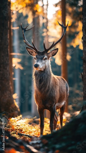 cervid, antler, forest, wildlife, nature, animal, mammal, brown, autumn, wood, tree, gold, sunlight, photo, forest floor, leaf, beauty, calm, serenity, mammal, foliage, wild animal, horizontal, natural light, colours, animal, hunting, wild, copy space, standing