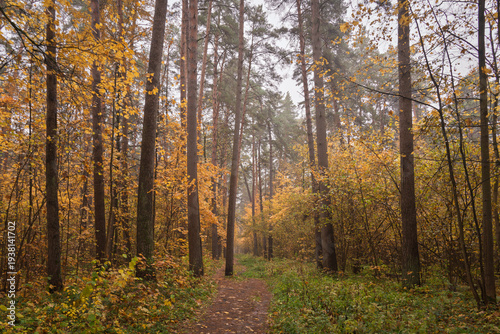 Forest path in autumn through tall pines and maple trees with golden yellow foliage. Natural beauty and tranquility perfect for background image and travel concept. Golden autumn.