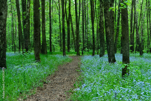 forest with footpath and wild blue flowers, tree trunks with bright green foliage. nature background. Beautiful atmosphere forest landscape. spring summer season. relaxation walk concept