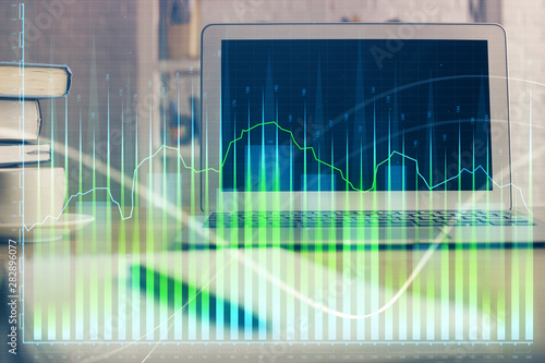 Forex market graph hologram and personal computer on background. Multi exposure. Concept of investment.