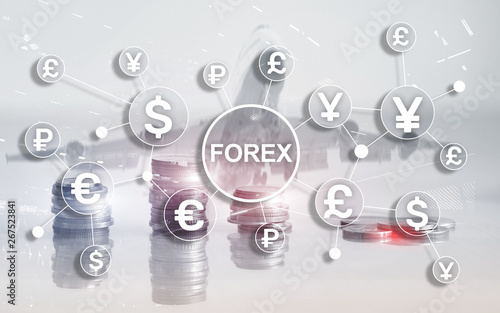 Forex trading currency exchange business finance diagrams dollar euro icons on blurred background.