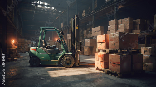 forklift transport heavy loads of inventory from one end of the warehouse. Generative AI