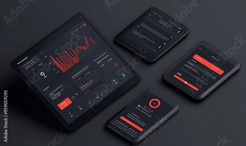 Four Black Smartphones with Red Accents and Data Displays