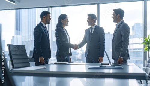 Four business professionals shake hands in a bright, modern office boardroom overlooking a city skyline.