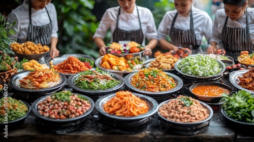 food, chef, cook, buffet, catering, kitchen, eatery, service, table, meal, dish, plate, serving, prepare, culinary, cooking, kitchen utensile, teamwork, team, dinner, lunch, snack, epicure, asian, asian cuisine, chinese, japanese, thai, vietnamese, korean, delicious, fresh, healthy, favor, taste, dining, eat, accessing, side dish, dessert, vegetable, meat, seafood, spicey, sweet, savoury, sauce