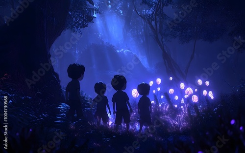 Four children silhouetted against a mystical forest filled with glowing flowers, creating an enchanting, dream-like atmosphere.