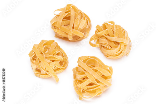 Four Classic Italian Raw Egg Fettuccine - Isolated on White Background. Dry Twisted Uncooked Pasta. Italian Culture and Cuisine. Raw Golden Macaroni Pattern - Isolation