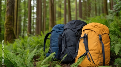 Four colorful backpacks rest on vibrant green ferns in a forest, symbolizing adventure, exploration, and readiness for new journeys.
