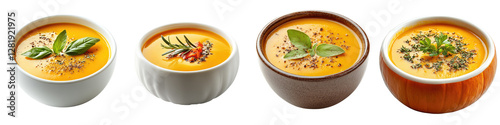 Four delicious bowls of colorful soup garnished with fresh herbs and spices.