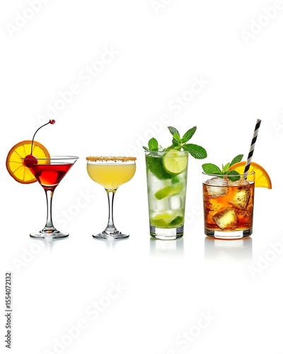 Four distinct cocktails with garnishes on white background drink beverage