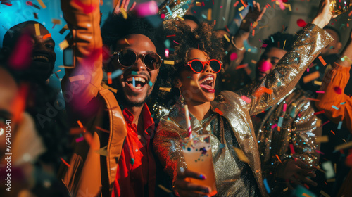 party, celebration, confetti, friends, happiness, joy, fun, dancing, nightlife, vibrant, energy, excitement, woman, man, smiling, cheerful, club, music, festive, entertainment, group, young, adult, event, colourful, crowd, enjoyment, together, leisure, motion, bright, people, youth, fashion, modern, indoor, festivity, social, gathering, active