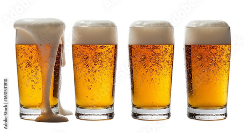 Four glasses of beer with overflowing foam isolated on transparent background, perfect for a party, celebration, or a refreshing drink