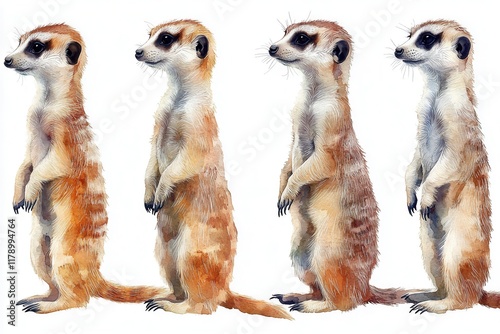 Four illustrated meerkats standing upright in a row, showcasing their playful stance.