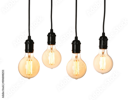 light, bulb, filament, electric, power, energy, illumination, glow, warm, bright, vintage, retro, industrial, modern, simple, clean, dark, black, background, 4, hanging, suspended, cord, wire, mains outlet, flocked, group, array, row, object, subject, decor, home, interior, design, conceptual, creative, idea, inspiration, technology, invention, electricity, supply, source, radiance, shine