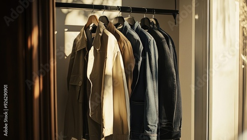 hanger, wooden, clothes, clothes rack, closet, denim, jacket, jacket, blue, coat, beige, hanging, fashion, style, apparel, casual attire, retail, shop, boutique, clothing, fabric, texture, display, window, light, sun, shadow, interior