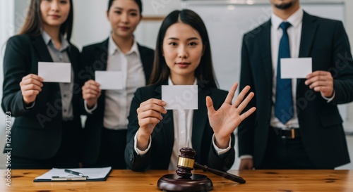 Four legal professionals hold up blank cards while one gestures to indicate a point in a meeting