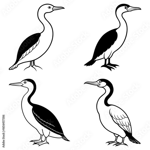 cormorant, bird, avian, wildlife, nature, animal, water bird, seabird, outline, drawing, illustration, vector, black, white, plumage, pose, standing, ground, neck, beak, eye, wing, feather, silhouette, isolated, graphic, design, art, clip art, symbol, icon, shape, element, decorative, simple, elegant, minimalist, monochrome, pattern, template, background, artwork, vignetting, style, image, creature, fauna, collection