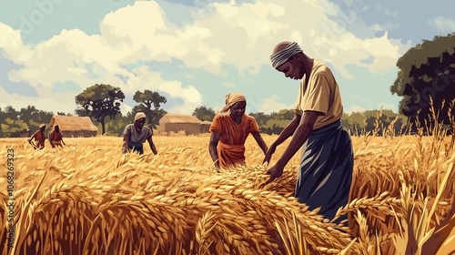 field, wheat, harvest, farmer, agriculture, rural, farm, people, work, hand, gold, nature, countryside, crop, landscape, sky, cloud, labor, food, produce, sun, land, green, brown, summer, men at work, season, tradition, africa, african, industry, grass, farming, ground, group, growth, harvesting, manual, rural area, sunlight, sunny, traditional, woman, woman