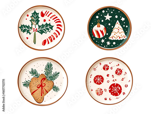 Four round christmas cookies decorated with festive designs isolated on transparent background