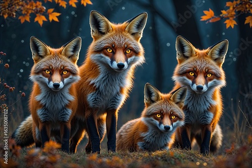 Four Skittish Foxes with Sparkling Eyes in a Mystical Autumn Night