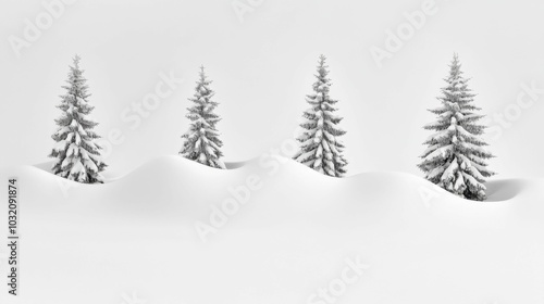 Four snow-covered pine trees standing in a row on a gentle snow-covered landscape with soft, smooth snowdrifts in a serene winter setting..